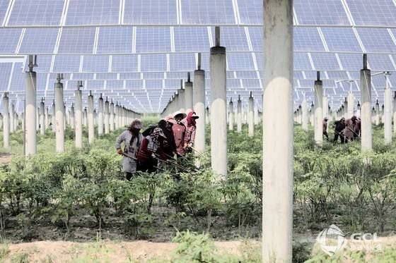協鑫新能源副總裁張耀邦介紹,該基地聯合江蘇省農科院、南京農業(yè)大學等科研院所,為該基地設計出一款高支架,使光伏板距地面高達2.8米。將常規(guī)5米立柱桁架跨度加寬到7米。同時,因地制宜地研發(fā)出96片、單塊415瓦的超大組件,增加農作物的光照面積,并采用自主研發(fā)的平單軸跟蹤技術,對陽光進行智能跟蹤,確保陽光最大化直射光伏板和農作物。